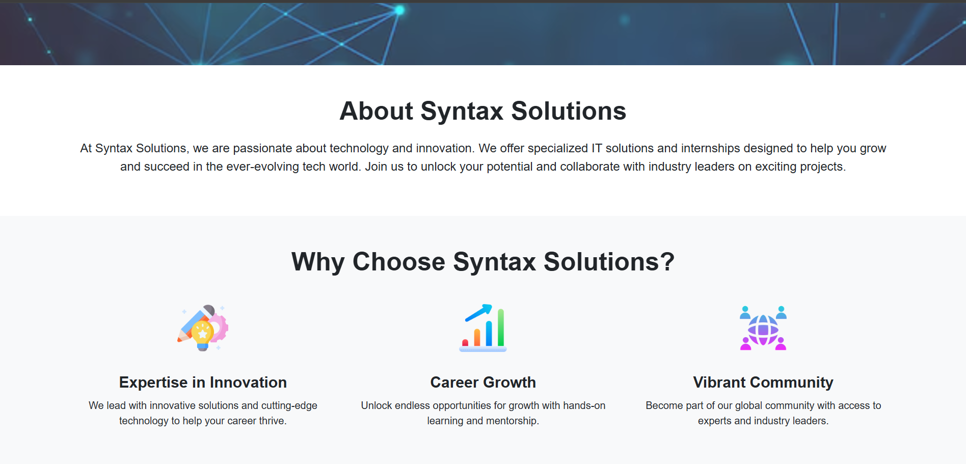 Visit"Syntax Solutions, we craft innovative mobile apps and websites that empower businesses and individuals, Our team of skilled developers focuses on delivering cutting-edge solutions tailored to your unique needs Transform your ideas into digital success."
